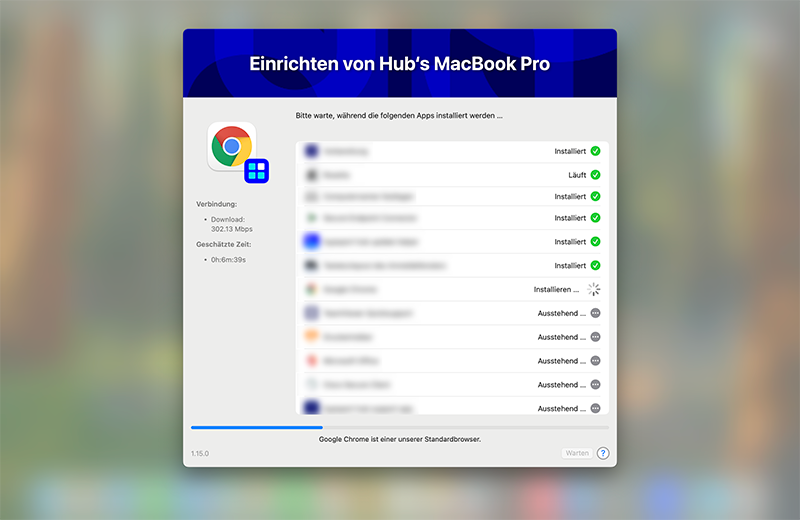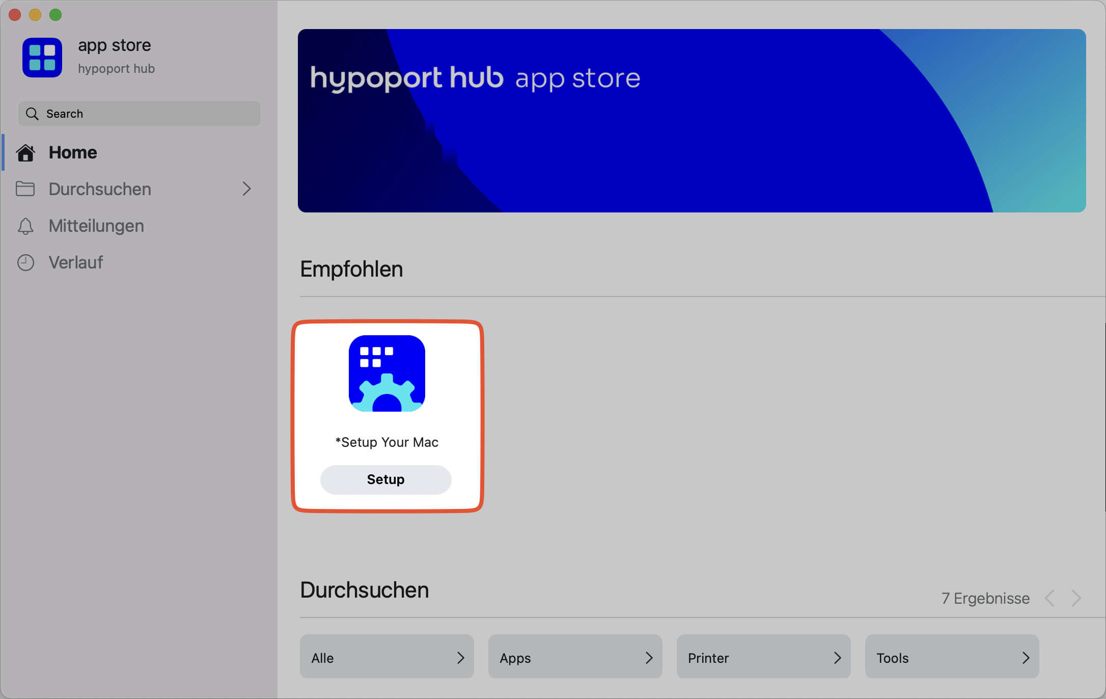 Normalerweise sollte „Setup Your Mac“ sofort starten, damit du direkt mit der Einrichtung fortfahren kannst. In diesem Fall starte den hypoport hub app store und führe dort die Policy „*Setup Your Mac“ aus.