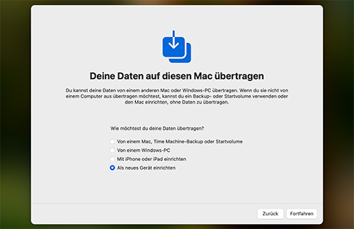 Im Setup Assistent von macOS wirst du durch die Einrichtung geleitet. Folge den Anweisungen auf dem Bildschirm, bis du zum Desktop gelangst.